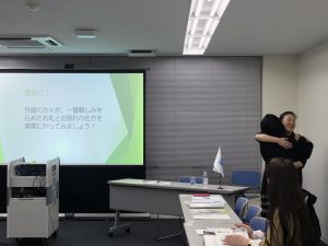 国際都市福岡として、私たちも外国からのゲストにできることはあると思います。今回の卓話でそのヒントと勇気をいただきました。卓話の最後は、親しみを込めた別れの挨拶として皆でハグをしあい、とても和やかな雰囲気での卓話終了となりました。